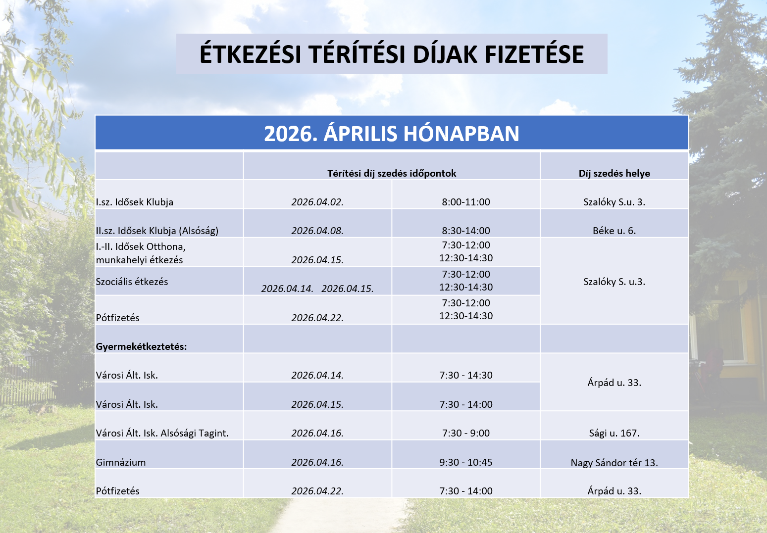 | Szociális étkezés | 2026.04.14. 2026.04.15. | 7:30-12:00 12:30-14:30 | |