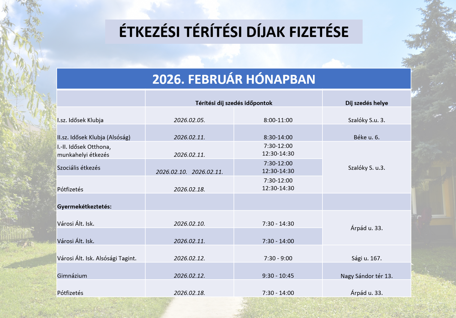 | Pótfizetés | 2026.02.18. | 7:30 - 14:00 | Árpád u. 33. |