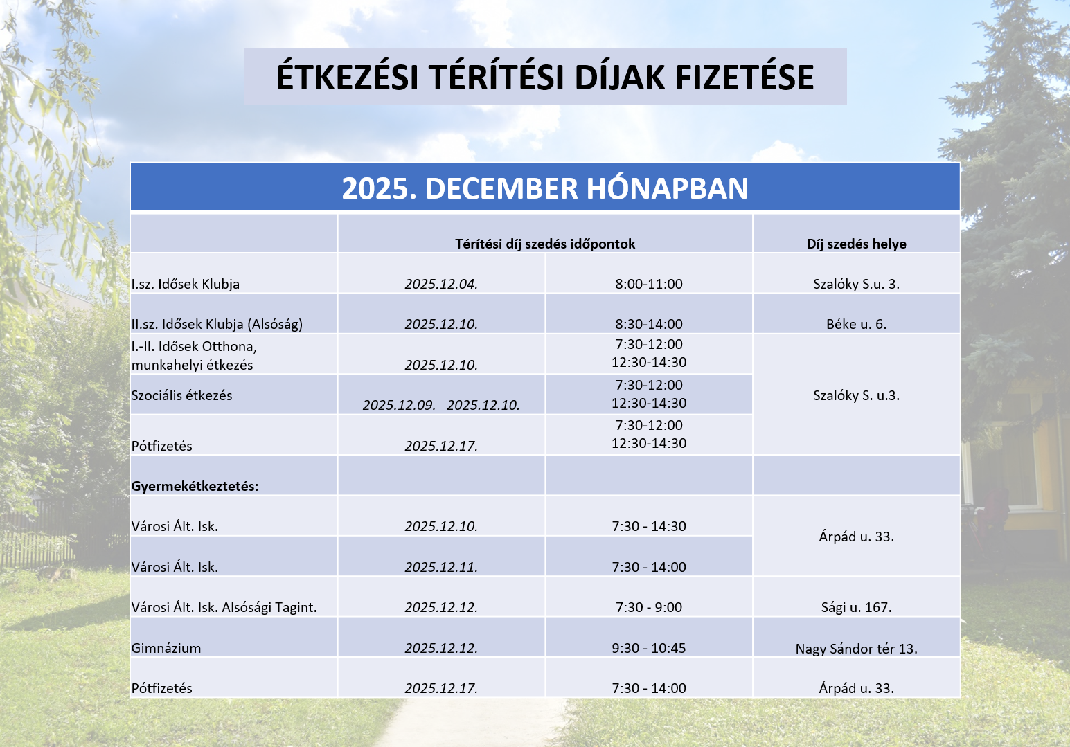 | Pótfizetés | 2025.12.17. | 7:30 - 14:00 | Árpád u. 33. |